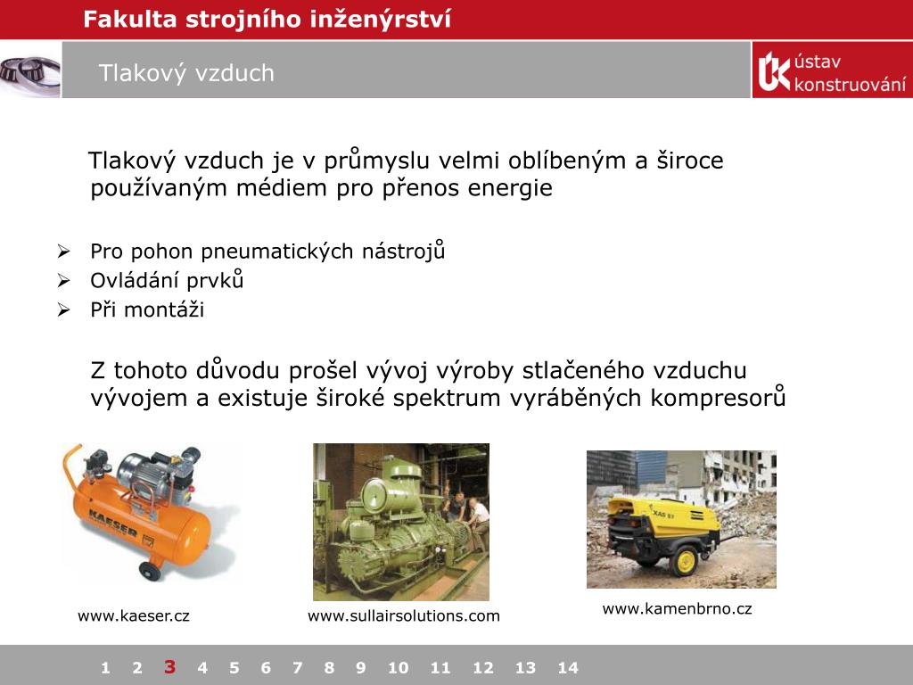 Tlakový vzduch Tlakový vzduch je v průmyslu velmi oblíbeným a široce používaným médiem pro přenos energie Pro pohon pneumatických nástrojů Ovládání prvků Při montáži Z tohoto důvodu prošel vývoj výroby stlačeného vzduchu vývojem a existuje široké spektrum vyráběných kompresorů www.kamenbrno.cz www.kaeser.cz www.sullairsolutions.com 1 2 3 4 5 6 7 8 9 10 11 12 13 14