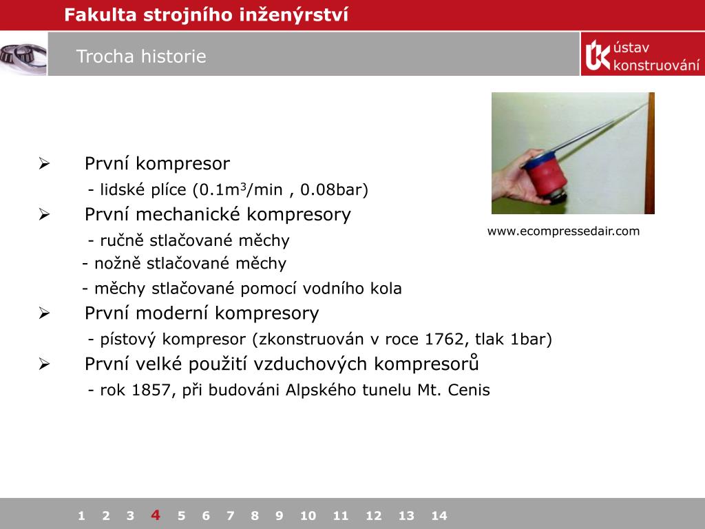 První kompresor - lidské plíce (0.1m3/min , 0.08bar) První mechanické kompresory - ručně stlačované měchy - nožně stlačované měchy - měchy stlačované pomocí vodního kola První moderní kompresory - pístový kompresor (zkonstruován v roce 1762, tlak 1bar) První velké použití vzduchových kompresorů - rok 1857, při budováni Alpského tunelu Mt. Cenis Trocha historie www.ecompressedair.com 1 2 3 4 5 6 7 8 9 10 11 12 13 14