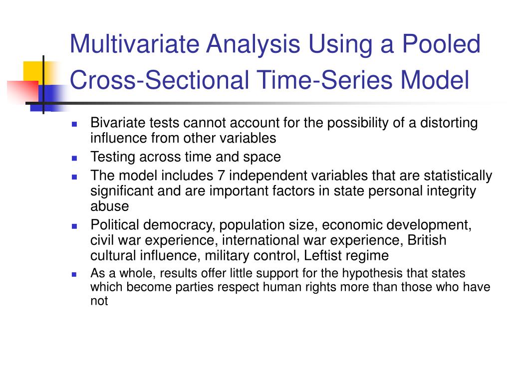 Multivariate Analysis Using a Pooled Cross-Sectional Time-Series Model • Bivariate tests cannot account for the possibility of a distorting influence from other variables • Testing across time and space • The model includes 7 independent variables that are statistically significant and are important factors in state personal integrity abuse • Political democracy, population size, economic development, civil war experience, international war experience, British cultural influence, military control, Leftist regime • As a whole, results offer little support for the hypothesis that states which become parties respect human rights more than those who have not
