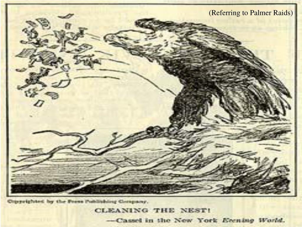 “Red Scare” – Palmer Raids • A.G. Palmer • created a new • agency in the • Justice Dept. • headed by • J. Edgar Hoover • to suppress • radicals. Police Arrest “Suspected Reds’ in Chicago, 1920
