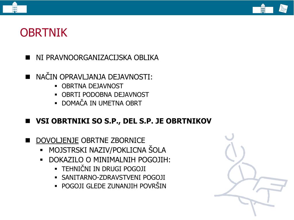 OBRTNIK • NI PRAVNOORGANIZACIJSKA OBLIKA • NAČIN OPRAVLJANJA DEJAVNOSTI: • OBRTNA DEJAVNOST • OBRTI PODOBNA DEJAVNOST • DOMAČA IN UMETNA OBRT • VSI OBRTNIKI SO S.P., DEL S.P. JE OBRTNIKOV • DOVOLJENJE OBRTNE ZBORNICE • MOJSTRSKI NAZIV/POKLICNA ŠOLA • DOKAZILO O MINIMALNIH POGOJIH: • TEHNIČNI IN DRUGI POGOJI • SANITARNO-ZDRAVSTVENI POGOJI • POGOJI GLEDE ZUNANJIH POVRŠIN