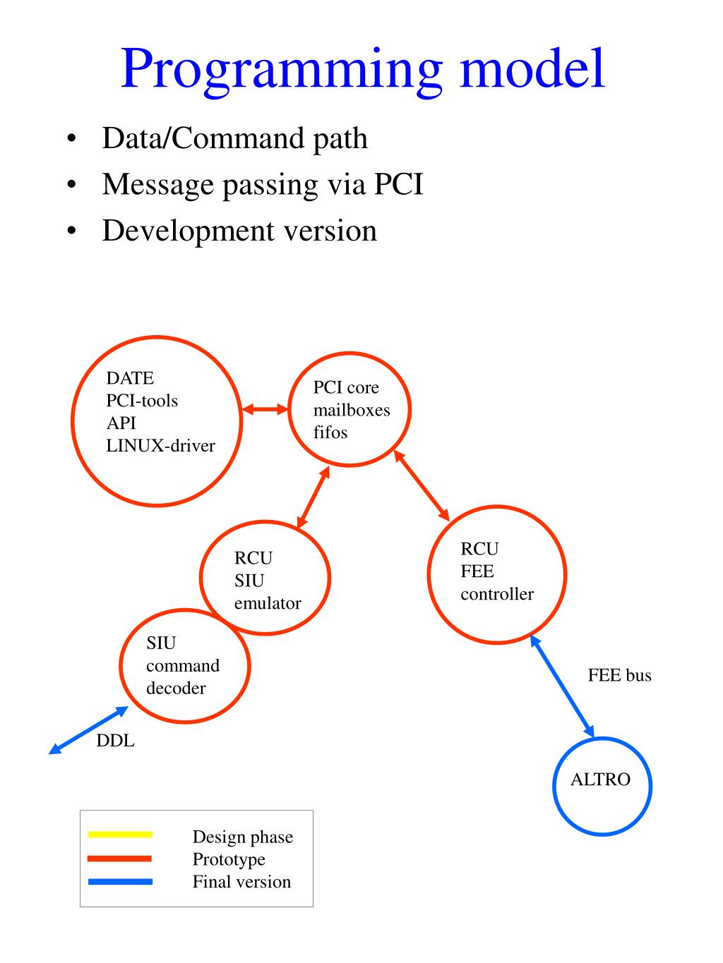Programming model • Data/Command path • Message passing via PCI • Development version DATE PCI-tools API LINUX-driver PCI core mailboxes fifos RCU FEE controller RCU SIU emulator SIU command decoder FEE bus DDL ALTRO Design phase Prototype Final version