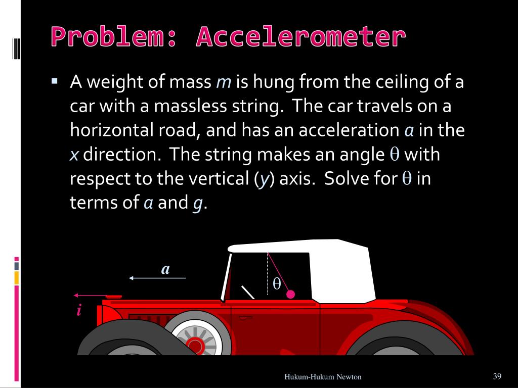 Problem: Accelerometer • A weight of mass m is hung from the ceiling of a car with a massless string. The car travels on a horizontal road, and has an acceleration a in the x direction. The string makes an angle with respect to the vertical (y) axis. Solve for in terms of a and g. a i Hukum-Hukum Newton