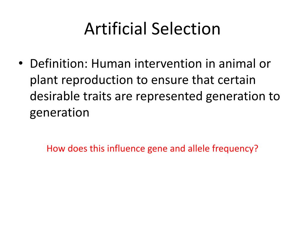 Artificial Selection • Definition: Human intervention in animal or plant reproduction to ensure that certain desirable traits are represented generation to generation How does this influence gene and allele frequency?