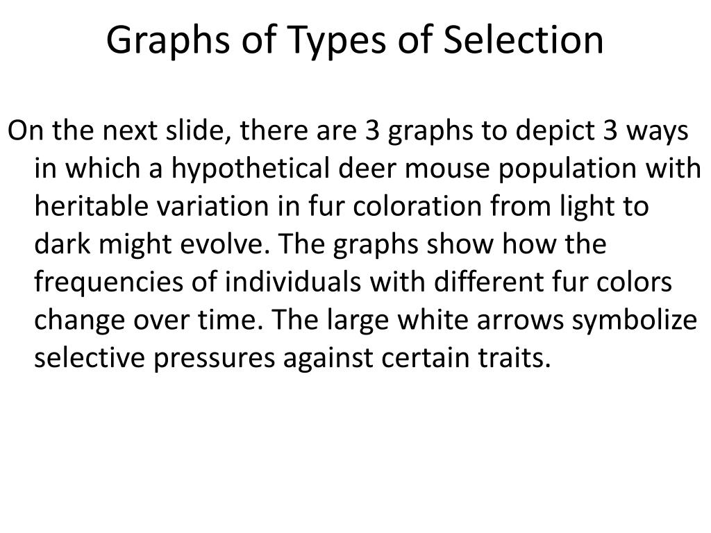 Graphs of Types of Selection On the next slide, there are 3 graphs to depict 3 ways in which a hypothetical deer mouse population with heritable variation in fur coloration from light to dark might evolve. The graphs show how the frequencies of individuals with different fur colors change over time. The large white arrows symbolize selective pressures against certain traits.