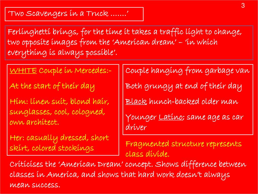 3 ‘Two Scavengers in a Truck …….’ Ferlinghetti brings, for the time it takes a traffic light to change, two opposite images from the ‘American dream’ – ‘in which everything is always possible’. WHITE Couple in Mercedes:- At the start of their day Him: linen suit, blond hair, sunglasses, cool, cologned, own architect. Her: casually dressed, short skirt, colored stockings Couple hanging from garbage van Both grungy at end of their day Black hunch-backed older man Younger Latino; same age as car driver Fragmented structure represents class divide. Criticises the ‘American Dream’ concept. Shows difference between classes in America, and shows that hard work doesn’t always mean success.