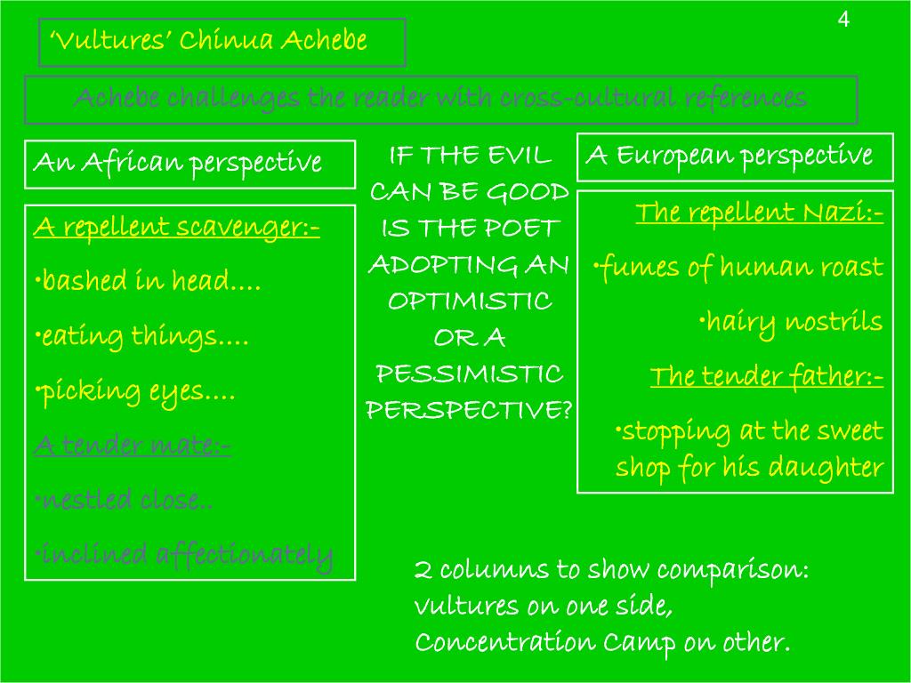 4 ‘Vultures’ Chinua Achebe Achebe challenges the reader with cross-cultural references Achebe challenges the reader with a cross-cultural dichotomy. IF THE EVIL CAN BE GOOD IS THE POET ADOPTING AN OPTIMISTIC OR A PESSIMISTIC PERSPECTIVE? A European perspective An African perspective • The repellent Nazi:- • fumes of human roast • hairy nostrils • The tender father:- • stopping at the sweet shop for his daughter • A repellent scavenger:- • bashed in head…. • eating things…. • picking eyes…. • A tender mate:- • nestled close.. • inclined affectionately 2 columns to show comparison: vultures on one side, Concentration Camp on other.
