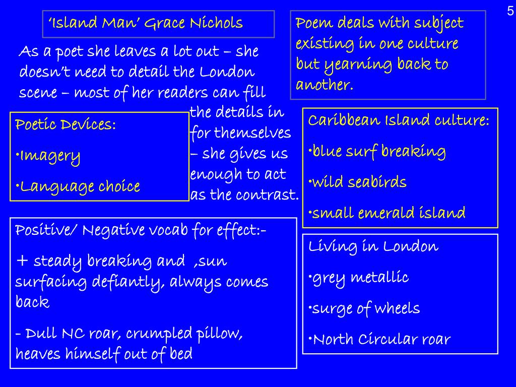 5 ‘Island Man’ Grace Nichols Poem deals with subject existing in one culture but yearning back to another. As a poet she leaves a lot out – she doesn’t need to detail the London scene – most of her readers can fill the details in for themselves – she gives us enough to act as the contrast. • Caribbean Island culture: • blue surf breaking • wild seabirds • small emerald island • Poetic Devices: • Imagery • Language choice Positive/ Negative vocab for effect:- + steady breaking and ,sun surfacing defiantly, always comes back - Dull NC roar, crumpled pillow, heaves himself out of bed • Living in London • grey metallic • surge of wheels • North Circular roar