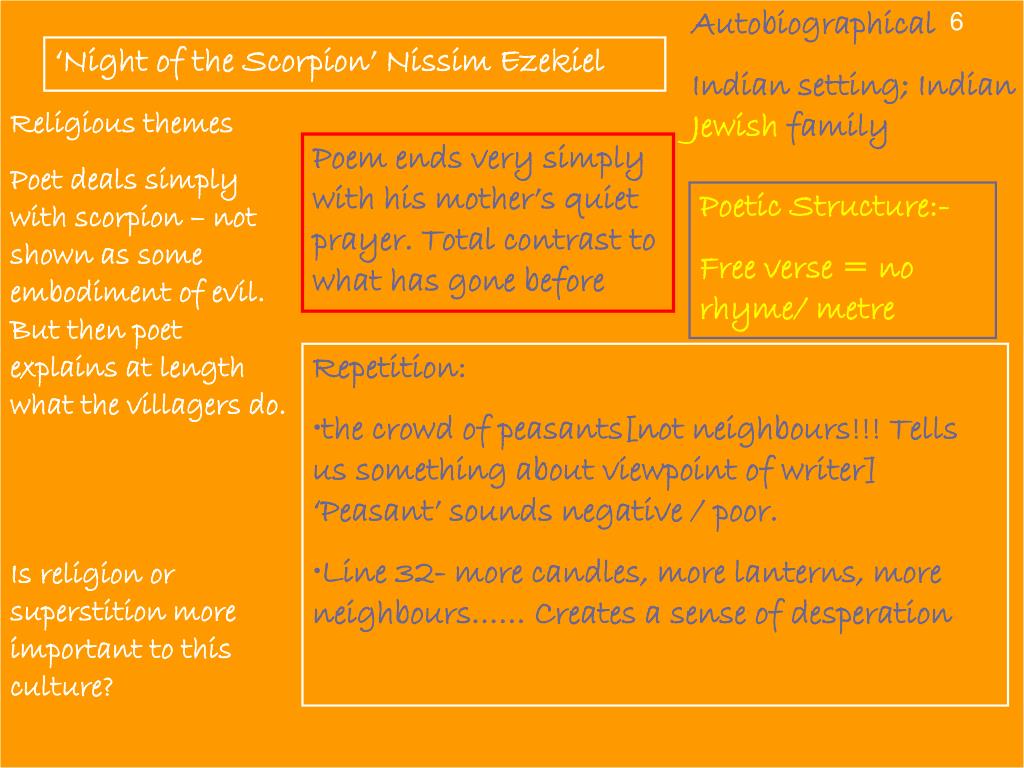 Autobiographical Indian setting; Indian Jewish family 6 ‘Night of the Scorpion’ Nissim Ezekiel Religious themes Poet deals simply with scorpion – not shown as some embodiment of evil. But then poet explains at length what the villagers do. Is religion or superstition more important to this culture? Poem ends very simply with his mother’s quiet prayer. Total contrast to what has gone before Poetic Structure:- Free verse = no rhyme/ metre • Repetition: • the crowd of peasants[not neighbours!!! Tells us something about viewpoint of writer] ‘Peasant’ sounds negative / poor. • Line 32- more candles, more lanterns, more neighbours…… Creates a sense of desperation