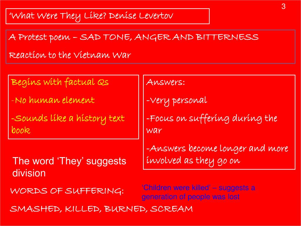 3 ‘What Were They Like? Denise Levertov A Protest poem – SAD TONE, ANGER AND BITTERNESS Reaction to the Vietnam War • Begins with factual Qs • No human element • -Sounds like a history text book Answers: -Very personal -Focus on suffering during the war -Answers become longer and more involved as they go on The word ‘They’ suggests division ‘Children were killed’ – suggests a generation of people was lost WORDS OF SUFFERING: SMASHED, KILLED, BURNED, SCREAM