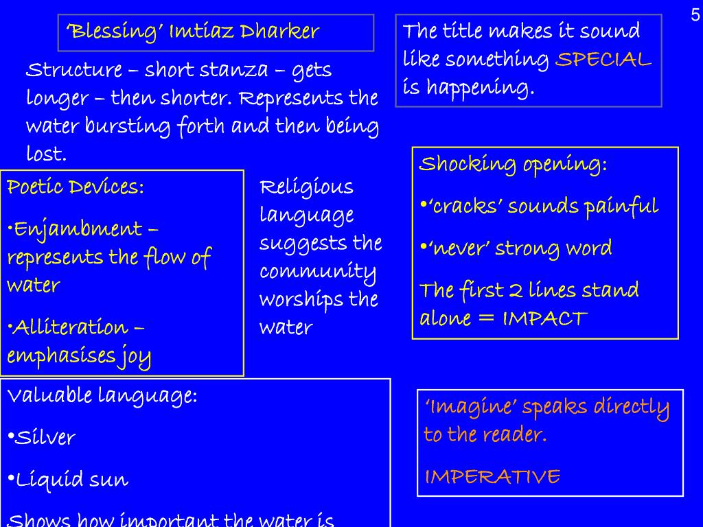 5 ‘Blessing’ Imtiaz Dharker The title makes it sound like something SPECIAL is happening. Structure – short stanza – gets longer – then shorter. Represents the water bursting forth and then being lost. • Shocking opening: • ‘cracks’ sounds painful • ‘never’ strong word • The first 2 lines stand alone = IMPACT • Poetic Devices: • Enjambment – represents the flow of water • Alliteration – emphasises joy Religious language suggests the community worships the water • Valuable language: • Silver • Liquid sun • Shows how important the water is ‘Imagine’ speaks directly to the reader. IMPERATIVE