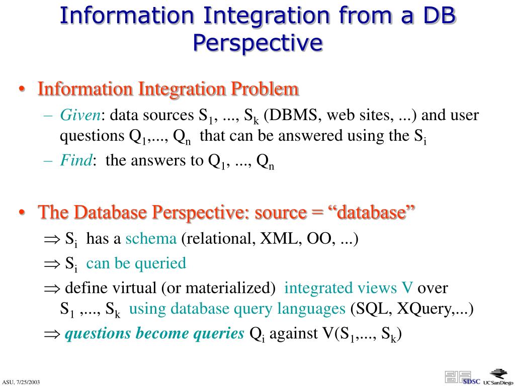 Information Integration from a DB Perspective • Information Integration Problem • Given: data sources S1, ..., Sk (DBMS, web sites, ...) and user questions Q1,..., Qn that can be answered using the Si • Find: the answers to Q1, ..., Qn • The Database Perspective: source = “database” • Si has a schema (relational, XML, OO, ...) • Sican be queried • define virtual (or materialized) integrated views Vover S1 ,..., Skusing database query languages(SQL, XQuery,...) • questions become queries Qi against V(S1,..., Sk)