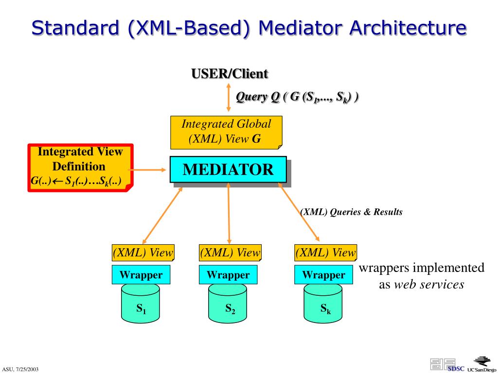 USER/Client Query Q ( G (S1,..., Sk) ) Integrated Global (XML) View G Integrated View Definition G(..) S1(..)…Sk(..) MEDIATOR (XML) Queries & Results Standard (XML-Based) Mediator Architecture (XML) View (XML) View (XML) View wrappers implemented as web services Wrapper Wrapper Wrapper S1 S2 Sk