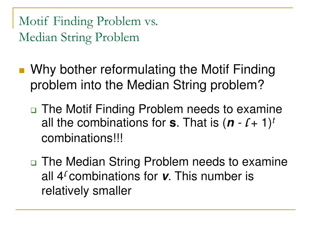 Motif Finding Problem vs. Median String Problem • Why bother reformulating the Motif Finding problem into the Median String problem? • The Motif Finding Problem needs to examine all the combinations for s. That is (n -l+ 1)t combinations!!! • The Median String Problem needs to examine all 4l combinations for v. This number is relatively smaller