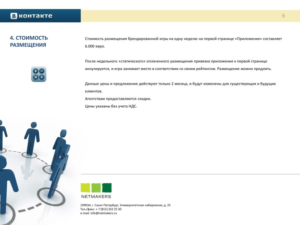 3. РАЗМЕЩЕНИЕ У вас есть шанс стать одни их первых клиентов, разместившимся вконтакте.ру. Вы оплачиваете размещение игры на первой странице раздела «Приложения» сроком на одну неделю. То есть, ваша брендированная игра (приложение) будет размещена на первой странице приложений на сайте www.vkontakte.ru. Среднее количество игроков, играющие в игры, размещенные на первой странице, 400.000-500.000 игроков. Умножьте это на 4 контакта в одной игре и повторные игры многими пользователями. Получите порядка 3.000.000 – 4.000.000 контактов, по качеству в 14-25 раз превышающих показ баннера.