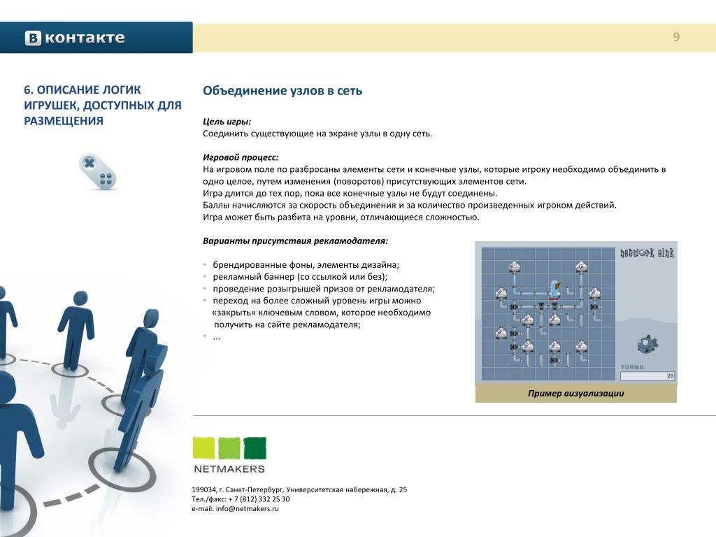 6. ОПИСАНИЕ ЛОГИК ИГРУШЕК, ДОСТУПНЫХ ДЛЯ РАЗМЕЩЕНИЯ • Объединение узлов в сеть • Цель игры: • Соединить существующие на экране узлы в одну сеть. • Игровой процесс: • На игровом поле по разбросаны элементы сети и конечные узлы, которые игроку необходимо объединить в одно целое, путем изменения (поворотов) присутствующих элементов сети. • Игра длится до тех пор, пока все конечные узлы не будут соединены. • Баллы начисляются за скорость объединения и за количество произведенных игроком действий. • Игра может быть разбита на уровни, отличающиеся сложностью. • Варианты присутствия рекламодателя: • брендированные фоны, элементы дизайна; • рекламный баннер (со ссылкой или без); • проведение розыгрышей призов от рекламодателя; • переход на более сложный уровень игры можно «закрыть» ключевым словом, которое необходимо получить на сайте рекламодателя; • ... Пример визуализации