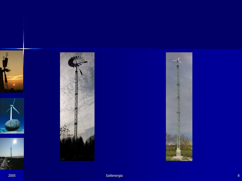 Vízszivattyút működtető szélmotorok csoportosítása • Csavarszivattyú (100m) • Dugattyús szivattyú (100m) • Többfokozatú centrifugál szivattyú (30m) • Mamutszivattyú (10m) • Membrán szivattyú (3m) • Centrifugál szivattyú (3m) • Kanalas láncos vízemelő (3m) • Csigaszivattyú (1m) Szélenergia
