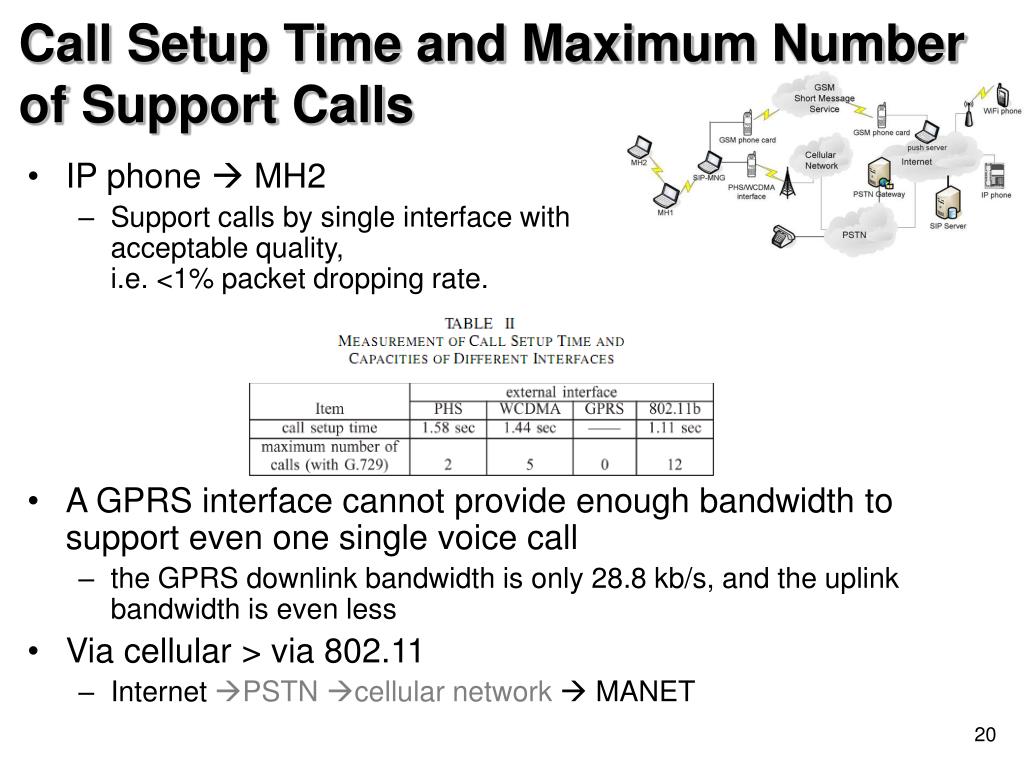 Call Setup Time and Maximum Number of Support Calls • IP phone MH2 • Support calls by single interface with acceptable quality, i.e. <1% packet dropping rate. • A GPRS interface cannot provide enough bandwidth to support even one single voice call • the GPRS downlink bandwidth is only 28.8 kb/s, and the uplink bandwidth is even less • Via cellular > via 802.11 • Internet PSTN cellular network MANET
