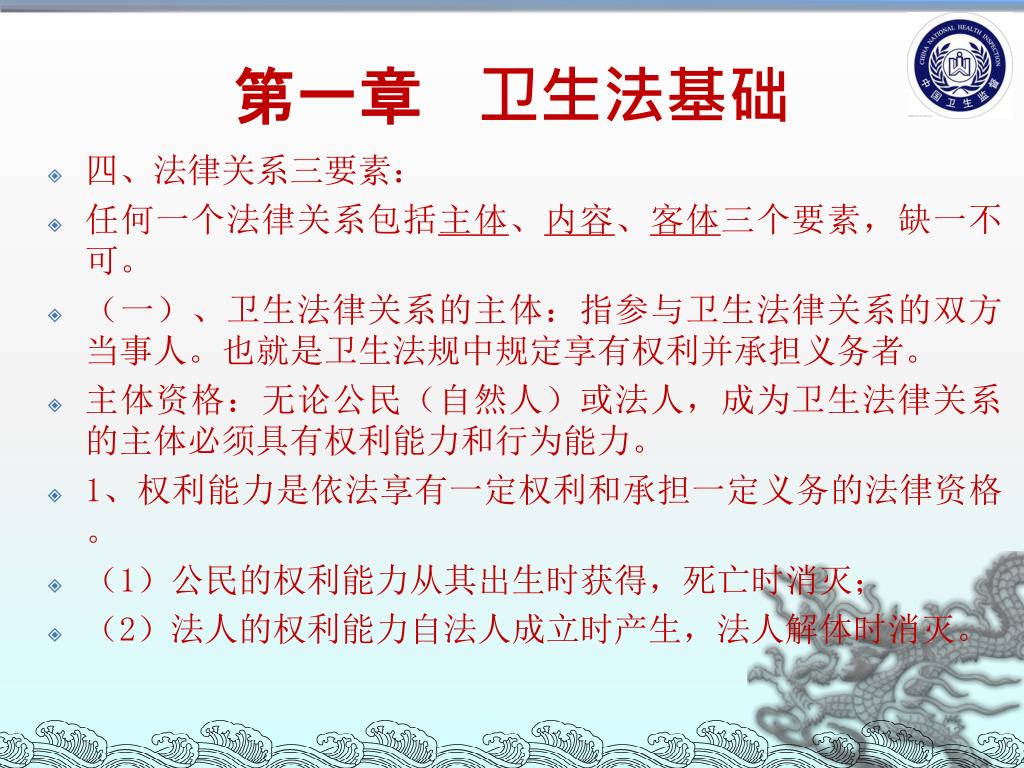 第一章卫生法基础 • 四、法律关系三要素: • 任何一个法律关系包括主体、内容、客体三个要素,缺一不可。 • (一)、卫生法律关系的主体:指参与卫生法律关系的双方当事人。也就是卫生法规中规定享有权利并承担义务者。 • 主体资格:无论公民(自然人)或法人,成为卫生法律关系的主体必须具有权利能力和行为能力。 • 1、权利能力是依法享有一定权利和承担一定义务的法律资格。 • (1)公民的权利能力从其出生时获得,死亡时消灭; • (2)法人的权利能力自法人成立时产生,法人解体时消灭。 12