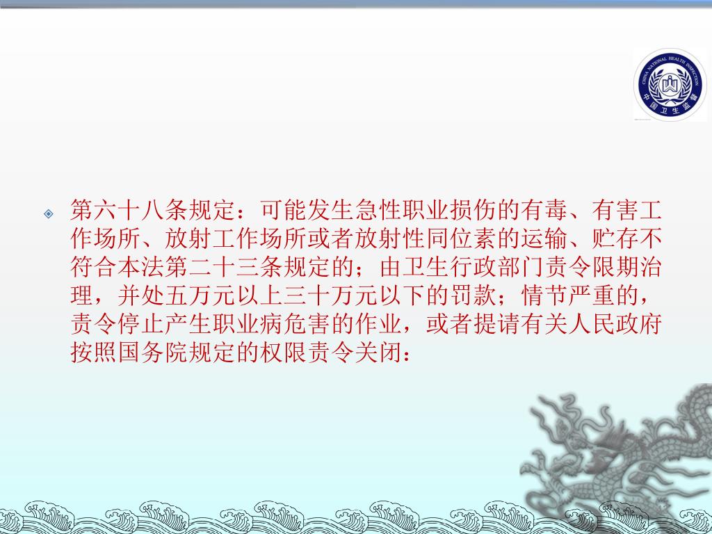 第二十三条 规定:对放射工作场所和放射性同位素的运输、贮存,用人单位必须配置防护设备和报警装置,保证接触放射线的工作人员佩戴个人剂量计。 • 第二十六条规定: 向用人单位提供可能产生职业病危害的化学品、放射性同位素和含有放射性物质的材料的,应当提供中文说明书。说明书应当载明产品特性、主要成份、存在的有害因素、可能产生的危害后果、安全使用注意事项、职业病防护以及应急救治措施等内容。产品包装应当有醒目的警示标识和中文警示说明。贮存上述材料的场所应当在规定的部位设置危险物品标识或者放射性警示标识。 • 进口放射性同位素、射线装置和含有放射性物质的物品的,按照国家有关规定办理。 42