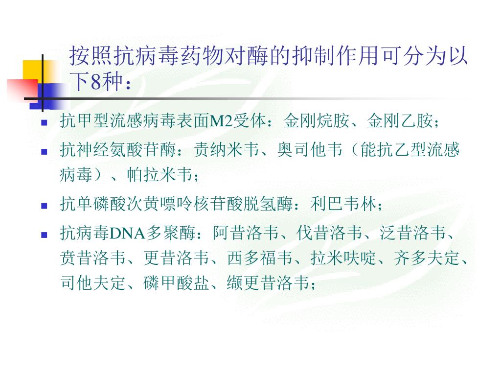 按照抗病毒药物对酶的抑制作用可分为以下8种:按照抗病毒药物对酶的抑制作用可分为以下8种: • 抗甲型流感病毒表面M2受体:金刚烷胺、金刚乙胺; • 抗神经氨酸苷酶:责纳米韦、奥司他韦(能抗乙型流感病毒)、帕拉米韦; • 抗单磷酸次黄嘌呤核苷酸脱氢酶:利巴韦林; • 抗病毒DNA多聚酶:阿昔洛韦、伐昔洛韦、泛昔洛韦、贲昔洛韦、更昔洛韦、西多福韦、拉米呋啶、齐多夫定、司他夫定、磷甲酸盐、缬更昔洛韦;