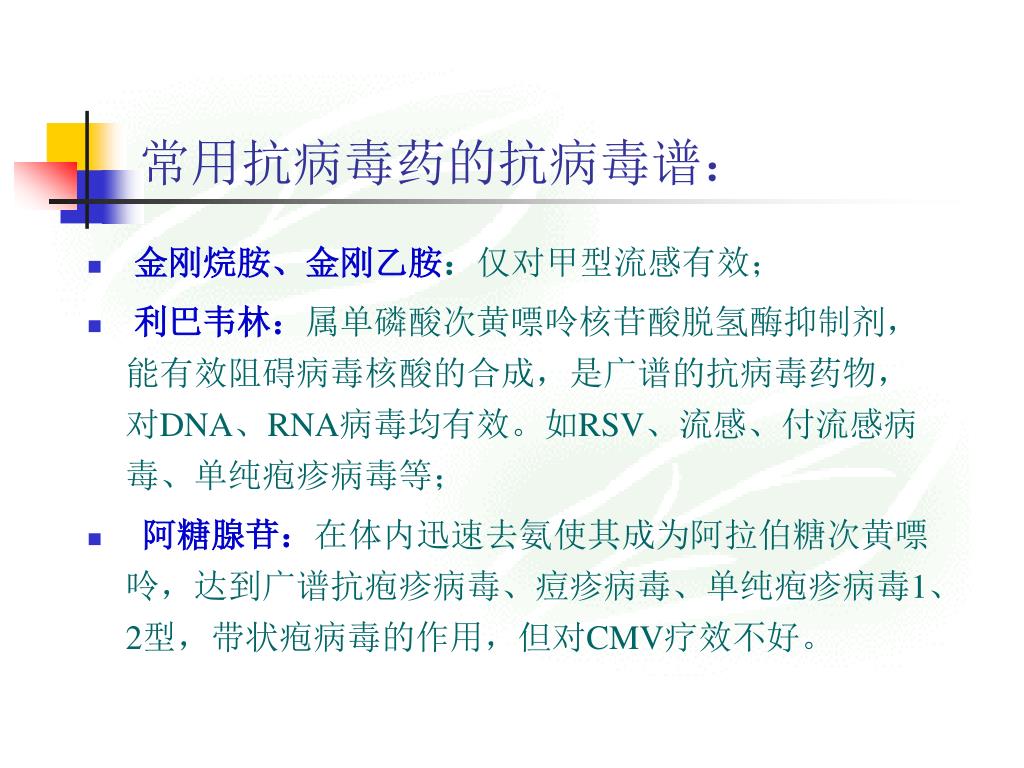 常用抗病毒药的抗病毒谱: • 金刚烷胺、金刚乙胺:仅对甲型流感有效; • 利巴韦林:属单磷酸次黄嘌呤核苷酸脱氢酶抑制剂,能有效阻碍病毒核酸的合成,是广谱的抗病毒药物,对DNA、RNA病毒均有效。如RSV、流感、付流感病毒、单纯疱疹病毒等; • 阿糖腺苷:在体内迅速去氨使其成为阿拉伯糖次黄嘌呤,达到广谱抗疱疹病毒、痘疹病毒、单纯疱疹病毒1、2型,带状疱病毒的作用,但对CMV疗效不好。