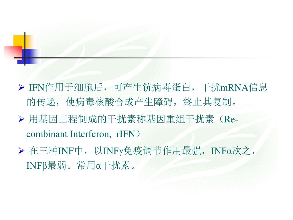 IFN作用于细胞后,可产生钪病毒蛋白,干扰mRNA信息的传递,使病毒核酸合成产生障碍,终止其复制。IFN作用于细胞后,可产生钪病毒蛋白,干扰mRNA信息的传递,使病毒核酸合成产生障碍,终止其复制。 • 用基因工程制成的干扰素称基因重组干扰素(Re-combinant Interferon, rIFN) • 在三种INF中,以INFγ免疫调节作用最强,INFα次之,INFβ最弱。常用α干扰素。
