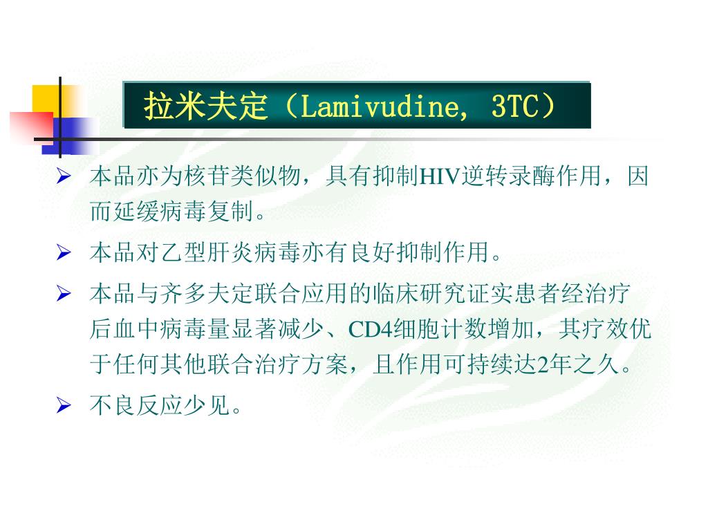 拉米夫定(Lamivudine, 3TC) • 本品亦为核苷类似物,具有抑制HIV逆转录酶作用,因而延缓病毒复制。 • 本品对乙型肝炎病毒亦有良好抑制作用。 • 本品与齐多夫定联合应用的临床研究证实患者经治疗后血中病毒量显著减少、CD4细胞计数增加,其疗效优于任何其他联合治疗方案,且作用可持续达2年之久。 • 不良反应少见。