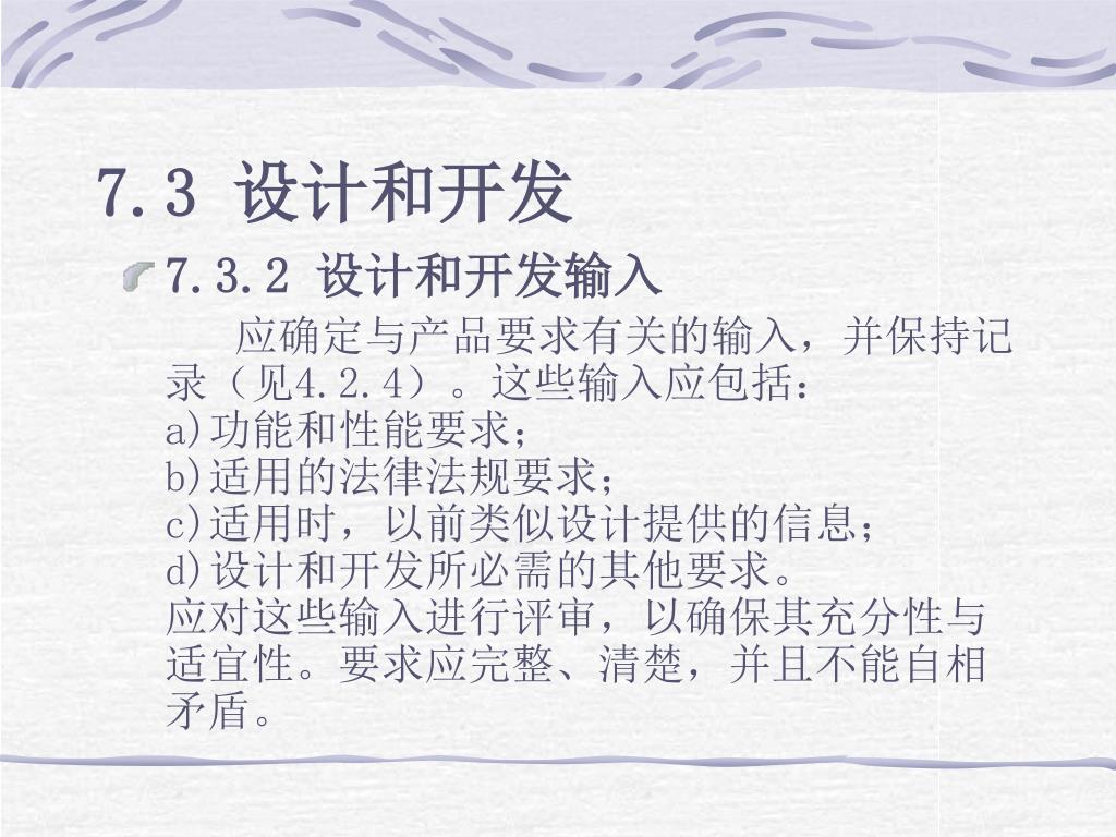7.3 设计和开发 • 7.3.2 设计和开发输入 应确定与产品要求有关的输入,并保持记录(见4.2.4)。这些输入应包括:a)功能和性能要求;b)适用的法律法规要求;c)适用时,以前类似设计提供的信息;d)设计和开发所必需的其他要求。应对这些输入进行评审,以确保其充分性与适宜性。要求应完整、清楚,并且不能自相矛盾。