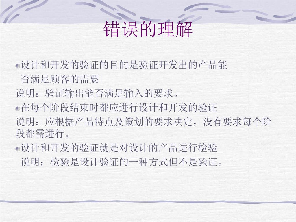 错误的理解 • 设计和开发的验证的目的是验证开发出的产品能 否满足顾客的需要 说明:验证输出能否满足输入的要求。 • 在每个阶段结束时都应进行设计和开发的验证 说明:应根据产品特点及策划的要求决定,没有要求每个阶段都需进行。 • 设计和开发的验证就是对设计的产品进行检验 说明:检验是设计验证的一种方式但不是验证。