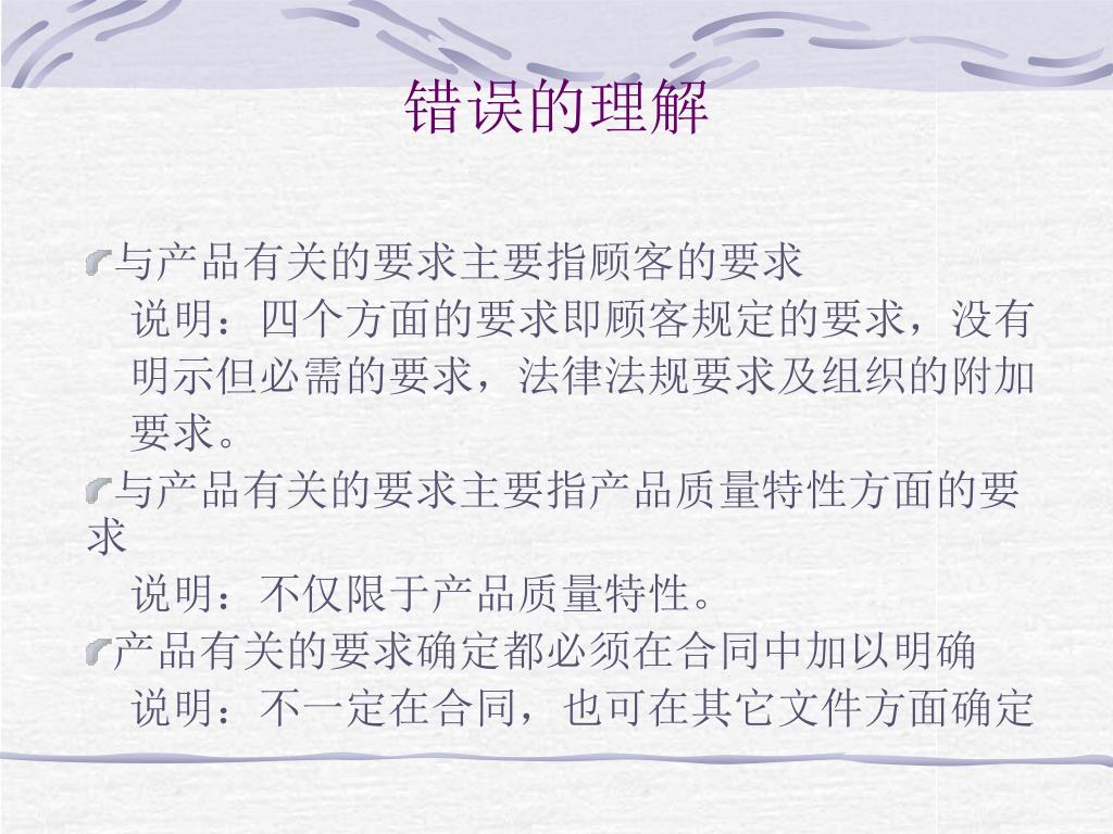 错误的理解 • 与产品有关的要求主要指顾客的要求 说明:四个方面的要求即顾客规定的要求,没有 明示但必需的要求,法律法规要求及组织的附加 要求。 • 与产品有关的要求主要指产品质量特性方面的要求 说明:不仅限于产品质量特性。 • 产品有关的要求确定都必须在合同中加以明确 说明:不一定在合同,也可在其它文件方面确定