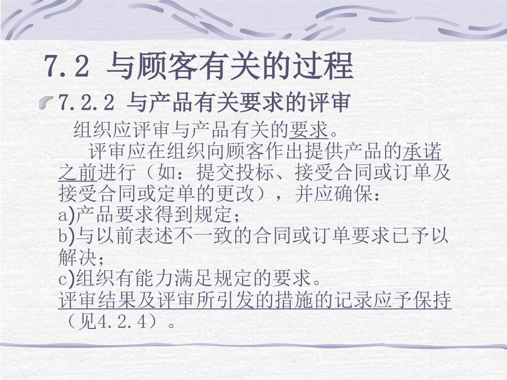 7.2 与顾客有关的过程 • 7.2.2 与产品有关要求的评审 组织应评审与产品有关的要求。 评审应在组织向顾客作出提供产品的承诺之前进行(如:提交投标、接受合同或订单及接受合同或定单的更改),并应确保:a)产品要求得到规定;b)与以前表述不一致的合同或订单要求已予以解决; c)组织有能力满足规定的要求。 评审结果及评审所引发的措施的记录应予保持(见4.2.4)。