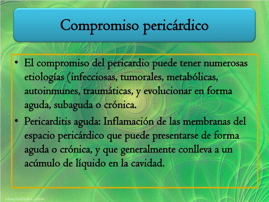 Compromiso pericárdico • El compromiso del pericardio puede tener numerosas etiologías (infecciosas, tumorales, metabólicas, autoinmunes, traumáticas, y evolucionar en forma aguda, subaguda o crónica. • Pericarditis aguda: Inflamación de las membranas del espacio pericárdico que puede presentarse de forma aguda o crónica, y que generalmente conlleva a un acúmulo de líquido en la cavidad.