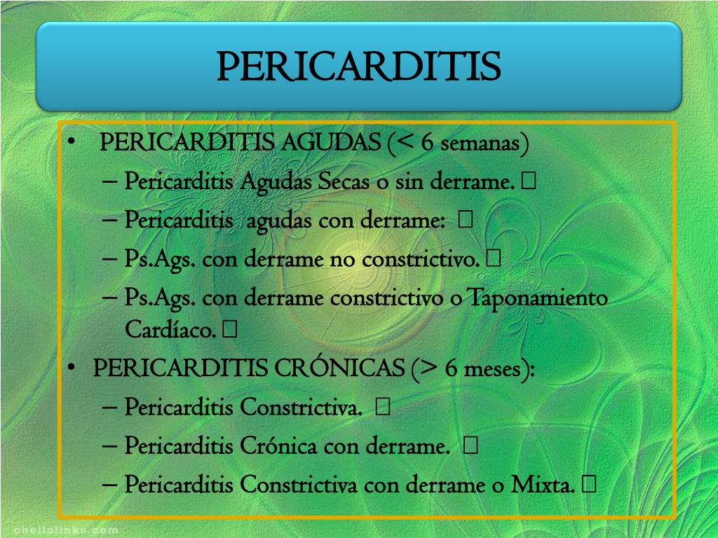 PERICARDITIS • PERICARDITIS AGUDAS (< 6 semanas) • Pericarditis Agudas Secas o sin derrame. • Pericarditis agudas con derrame: • Ps.Ags. con derrame no constrictivo. • Ps.Ags. con derrame constrictivo o Taponamiento Cardíaco. • PERICARDITIS CRÓNICAS (> 6 meses): • Pericarditis Constrictiva. • Pericarditis Crónica con derrame. • Pericarditis Constrictiva con derrame o Mixta.
