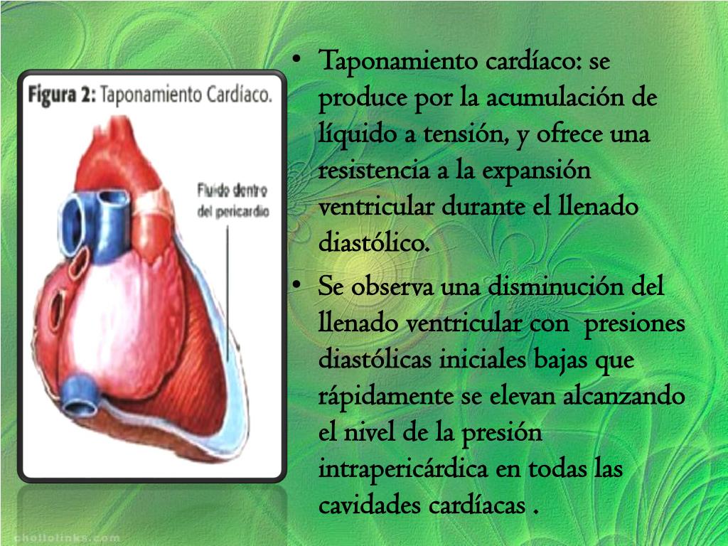 Taponamiento cardíaco: se produce por la acumulación de líquido a tensión, y ofrece una resistencia a la expansión ventricular durante el llenado diastólico. • Se observa una disminución del llenado ventricular con presiones diastólicas iniciales bajas que rápidamente se elevan alcanzando el nivel de la presión intrapericárdica en todas las cavidades cardíacas .