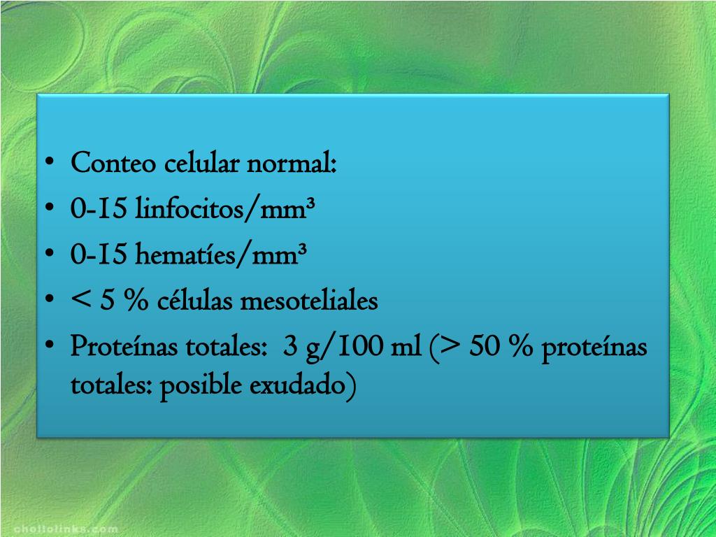 Conteo celular normal: • 0-15 linfocitos/mm³ • 0-15 hematíes/mm³ • < 5 % células mesoteliales • Proteínas totales: 3 g/100 ml (> 50 % proteínas totales: posible exudado)