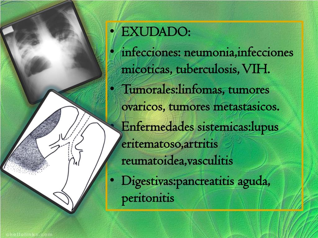 EXUDADO: • infecciones: neumonia,infeccionesmicoticas, tuberculosis, VIH. • Tumorales:linfomas, tumores ovaricos, tumores metastasicos. • Enfermedades sistemicas:lupuseritematoso,artritisreumatoidea,vasculitis • Digestivas:pancreatitis aguda, peritonitis