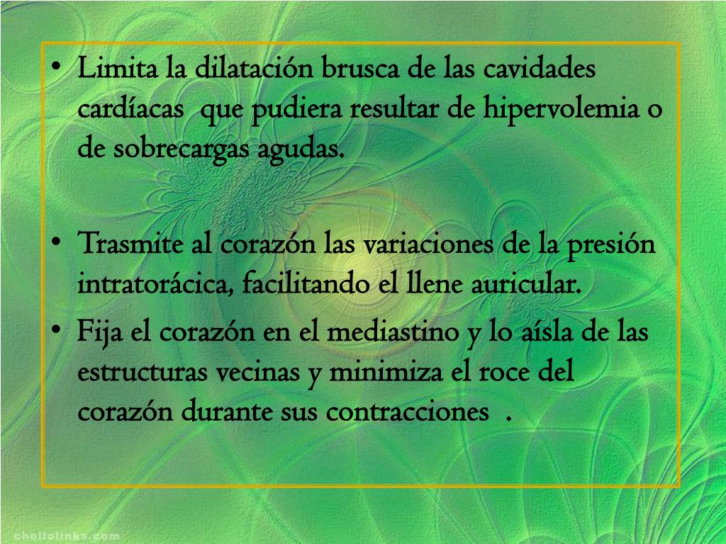 Limita la dilatación brusca de las cavidades cardíacas que pudiera resultar de hipervolemia o de sobrecargas agudas. • Trasmite al corazón las variaciones de la presión intratorácica, facilitando el llene auricular. • Fija el corazón en el mediastino y lo aísla de las estructuras vecinas y minimiza el roce del corazón durante sus contracciones .
