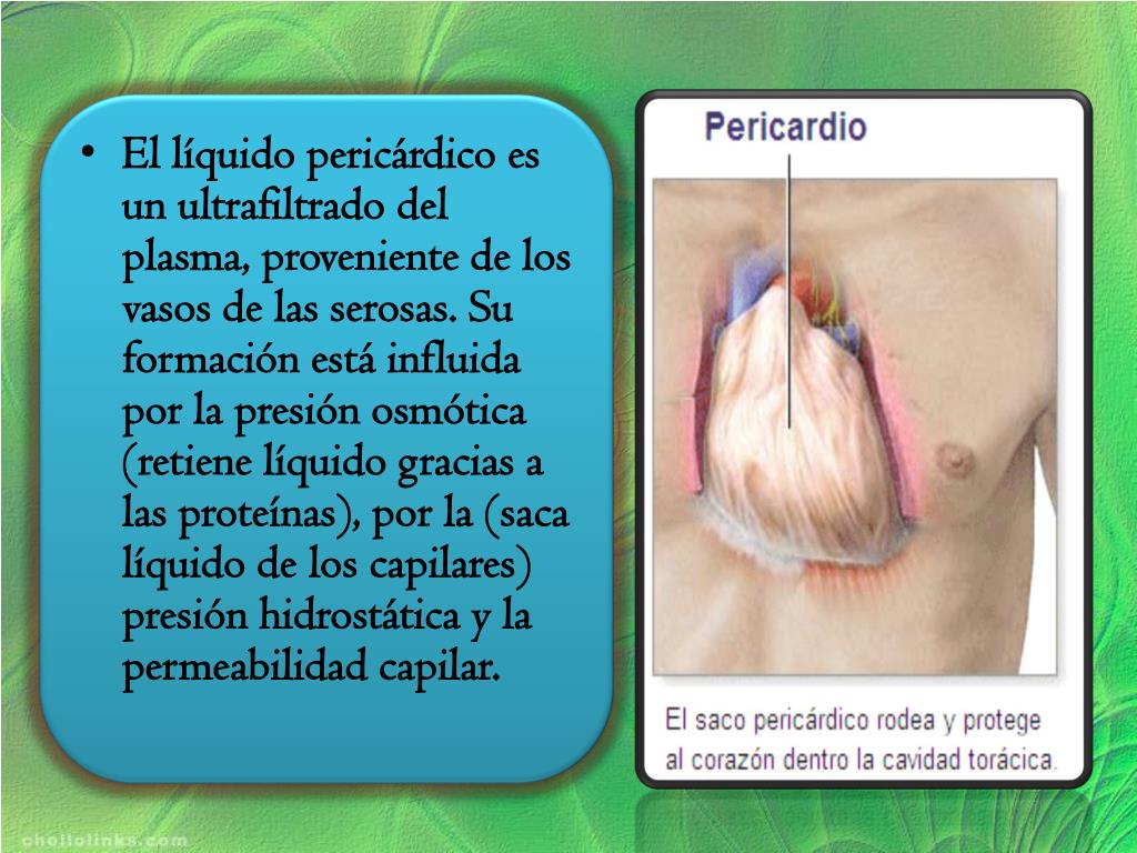 El líquido pericárdico es un ultrafiltrado del plasma, proveniente de los vasos de las serosas. Su formación está influida por la presión osmótica (retiene líquido gracias a las proteínas), por la (saca líquido de los capilares) presión hidrostática y la permeabilidad capilar.
