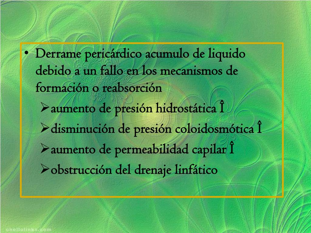 Derrame pericárdico acumulo de liquido debido aun fallo en los mecanismos de formación o reabsorción • aumento de presión hidrostática Î • disminución de presión coloidosmótica Î • aumento de permeabilidad capilar Î • obstrucción del drenaje linfático