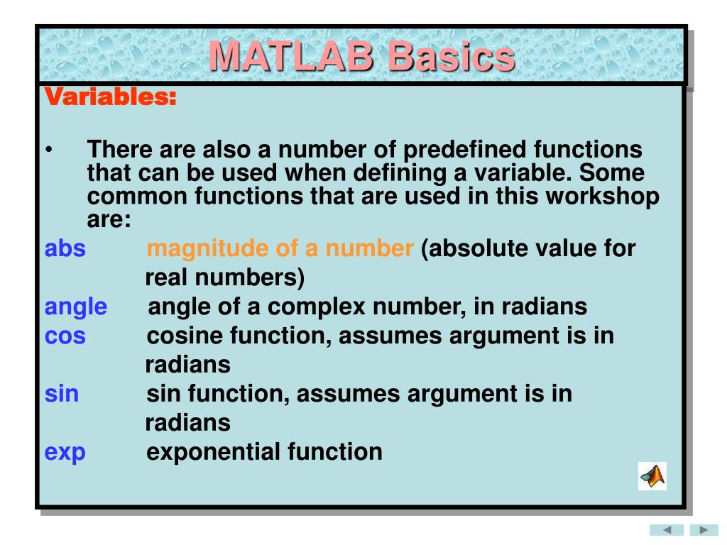 MATLAB Basics Variables: • There are also a number of predefined functions that can be used when defining a variable. Some common functions that are used in this workshop are: absmagnitude of a number (absolute value for real numbers) angle angle of a complex number, in radians cos cosine function, assumes argument is in radians sin sin function, assumes argument is in radians exp exponential function