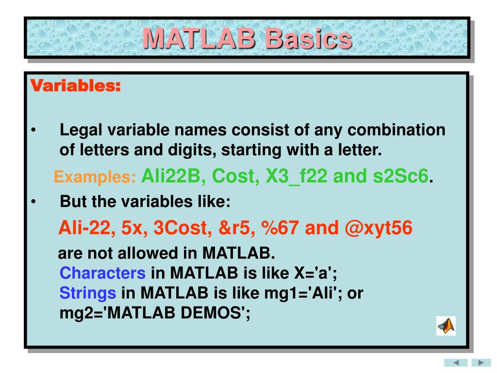 MATLAB Basics Variables: • Legal variable names consist of any combination of letters and digits, starting with a letter. Examples:Ali22B, Cost, X3_f22 and s2Sc6. • But the variables like: Ali-22, 5x, 3Cost, &r5, %67 and @xyt56 are not allowed in MATLAB.Characters in MATLAB is like X='a';Strings in MATLAB is like mg1='Ali'; or mg2='MATLAB DEMOS';