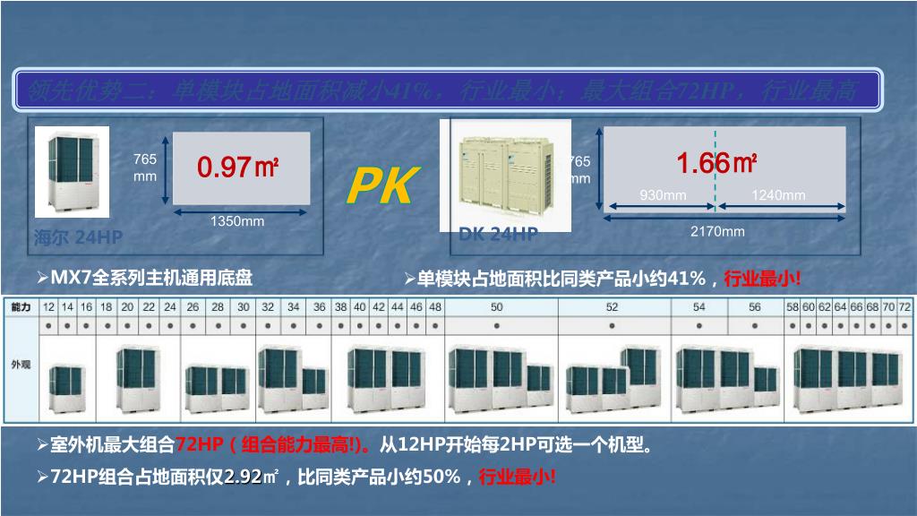 领先优势二:单模块占地面积减小41%,行业最小;最大组合72HP,行业最高领先优势二:单模块占地面积减小41%,行业最小;最大组合72HP,行业最高 1.66㎡ 0.97㎡ 765mm PK 765mm 930mm 1240mm 1350mm 2170mm DK 24HP 海尔 24HP • MX7全系列主机通用底盘 • 单模块占地面积比同类产品小约41%,行业最小! • 室外机最大组合72HP(组合能力最高!)。从12HP开始每2HP可选一个机型。 • 72HP组合占地面积仅2.92㎡,比同类产品小约50%,行业最小!