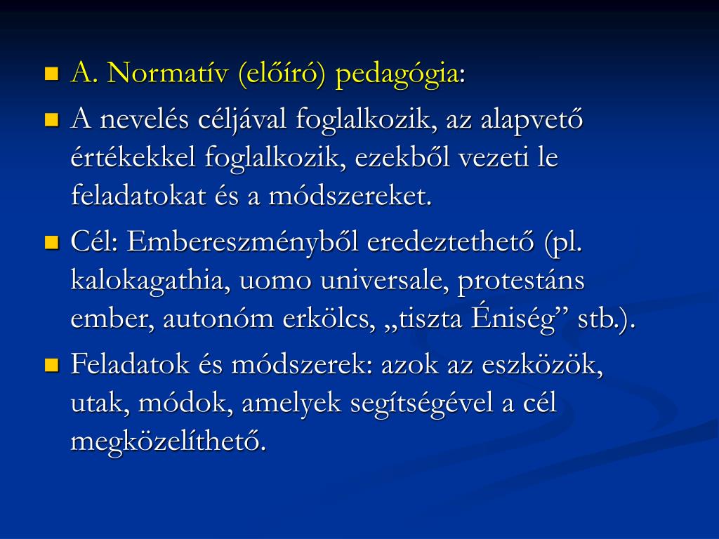 A. Normatív (előíró) pedagógia: • A nevelés céljával foglalkozik, az alapvető értékekkel foglalkozik, ezekből vezeti le feladatokat és a módszereket. • Cél: Embereszményből eredeztethető (pl. kalokagathia, uomo universale, protestáns ember, autonóm erkölcs, „tiszta Éniség” stb.). • Feladatok és módszerek: azok az eszközök, utak, módok, amelyek segítségével a cél megközelíthető.
