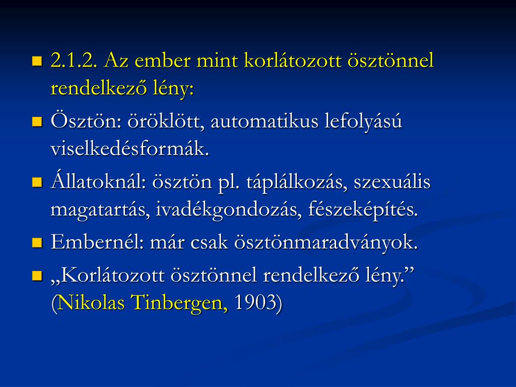 2.1.2. Az ember mint korlátozott ösztönnel rendelkező lény: • Ösztön: öröklött, automatikus lefolyású viselkedésformák. • Állatoknál: ösztön pl. táplálkozás, szexuális magatartás, ivadékgondozás, fészeképítés. • Embernél: már csak ösztönmaradványok. • „Korlátozott ösztönnel rendelkező lény.” (Nikolas Tinbergen, 1903)