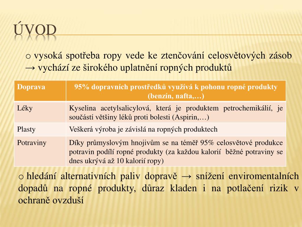 ÚVOD • vysoká spotřeba ropy vede ke ztenčování celosvětových zásob → vychází ze širokého uplatnění ropných produktů • hledání alternativních paliv dopravě → snížení enviromentalních dopadů na ropné produkty, důraz kladen i na potlačení rizik v ochraně ovzduší