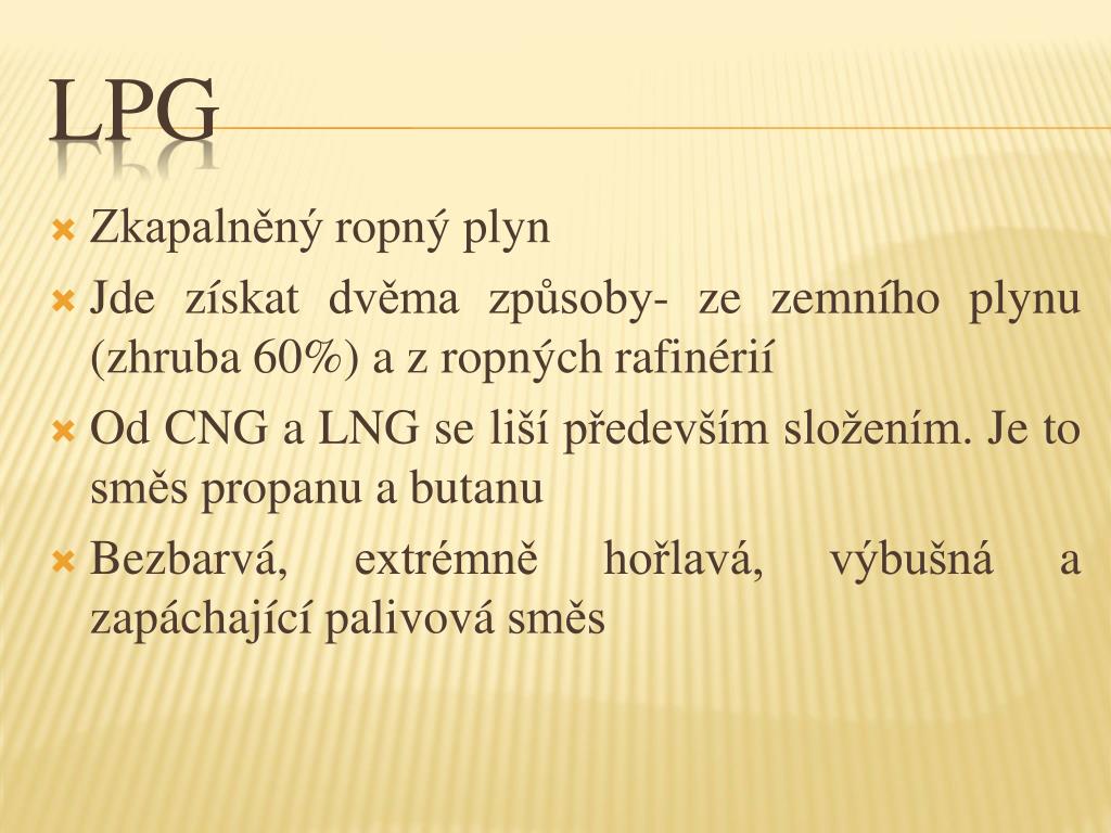 Zkapalněný ropný plyn Jde získat dvěma způsoby- ze zemního plynu (zhruba 60%) a z ropných rafinérií Od CNG a LNG se liší především složením. Je to směs propanu a butanu Bezbarvá, extrémně hořlavá, výbušná a zapáchající palivová směs LPG