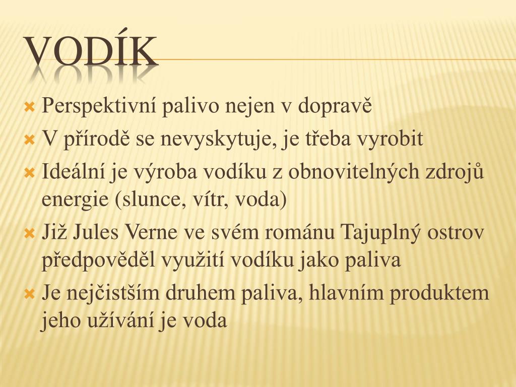 Perspektivní palivo nejen v dopravě V přírodě se nevyskytuje, je třeba vyrobit Ideální je výroba vodíku z obnovitelných zdrojů energie (slunce, vítr, voda) Již Jules Verne ve svém románu Tajuplný ostrov předpověděl využití vodíku jako paliva Je nejčistším druhem paliva, hlavním produktem jeho užívání je voda Vodík