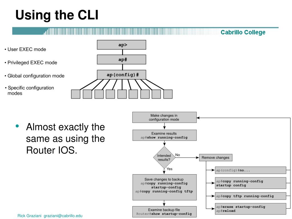 Connecting to the AP (Telnet) • AP Defaults • IP Address = 10.0.0.1/24 • Username and Password = Cisco (“C” not “c”) • This password is the privilege password, not the WEP password. Cisco Requires a network connection either Ethernet or Wireless Rick Graziani graziani@cabrillo.edu