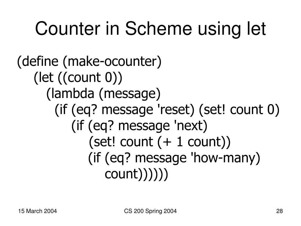 Counter in Scheme using let (define (make-ocounter) (let ((count 0)) (lambda (message) (if (eq? message 'reset) (set! count 0) (if (eq? message 'next) (set! count (+ 1 count)) (if (eq? message 'how-many) count)))))) CS 200 Spring 2004
